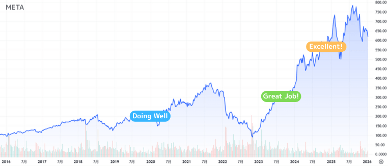 • 2021年〜2022年(「メタバース」への迷走と暗黒期) 突如として「メタ」への改名を宣言し、バーチャル世界(メタバース)への狂信的な投資を開始。しかし、これがファン(投資家)から「現実逃避」と猛反発を浴び、株価がピークから4分の1に大暴落。アイドル史上最大の「人気失墜」を経験しました。