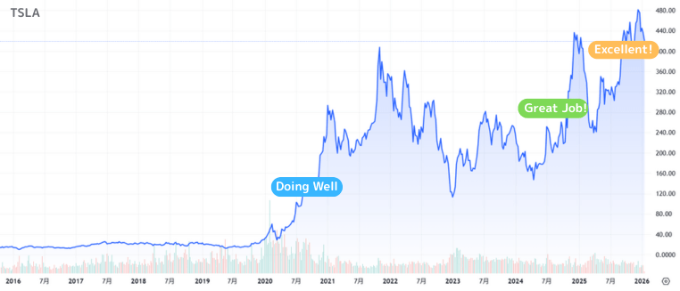 - 2020年〜2023年(時価総額1兆ドルの衝撃と苦悩) パンデミックを追い風に、自動車業界の既成概念を粉砕して時価総額1兆ドルの頂点へ。しかし、その後は中国勢という「強力なライバルグループ」の台頭や、値下げ競争による体力の消耗に苦しみました。